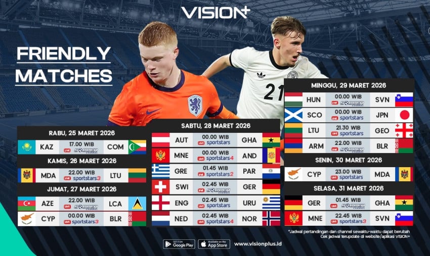 Sejumlah Laga internasional lain juga Akansegera menjadi sorotan. Duel Negeri-Negeri kuat Eropa seperti Inggris, Jerman, Belanda hingga Swiss dipastikan Memperkenalkan Laga Menarik Perhatian yang sayang Bagi dilewatkan. Berikut jadwal lengkap Friendly Match Internasional yang dapat disaksikan Ke VISION+: