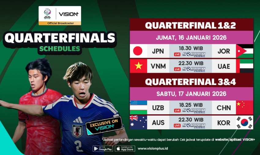 Bersama Mutu Regu yang tersisa, Putaran perempat final AFC U-23 Asian Cup 2026 dipastikan Memperkenalkan laga sarat gengsi, intensitas tinggi, dan penuh drama hingga menit akhir. Dukung Regu kesayangan kamu Di VISION+. Simak jadwal tayang dan link Penyiaran Langsung lengkapnya berikut: